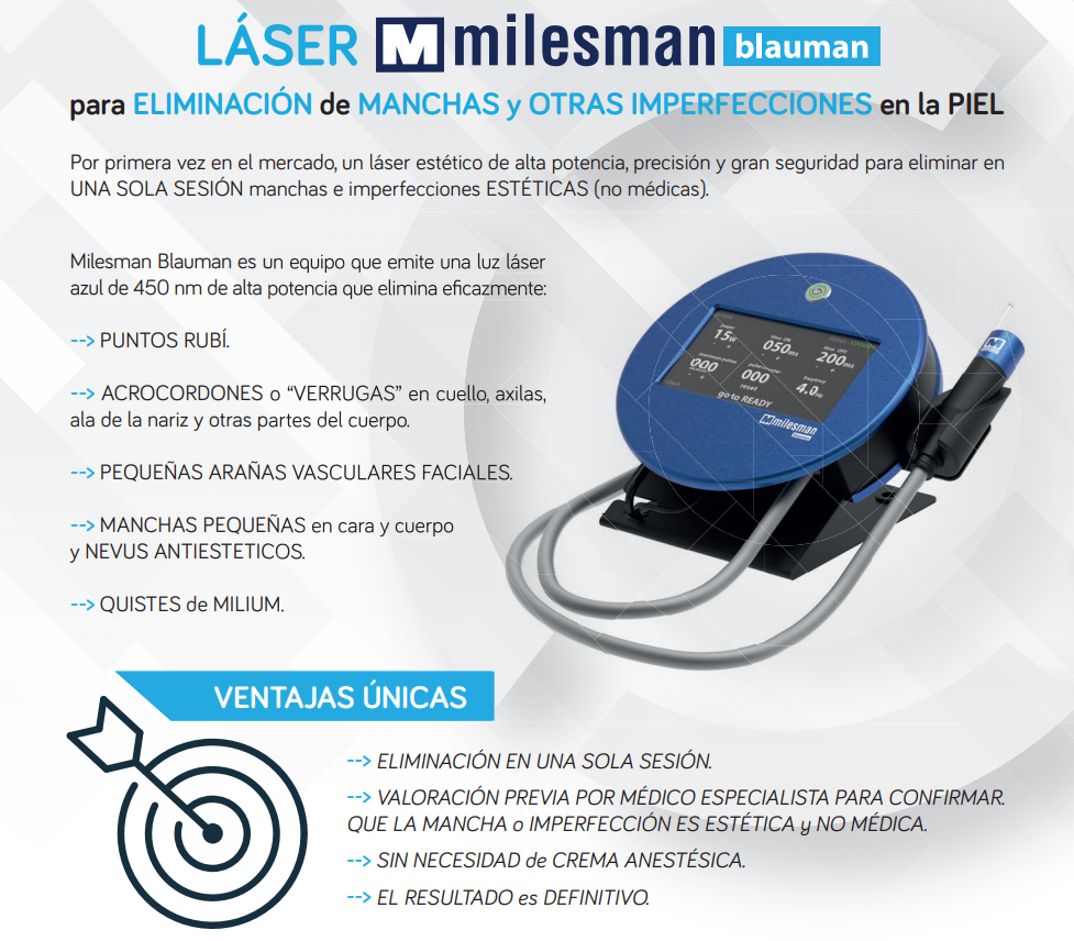 < Volver a Estética de última generaciónUsamos un exclusivo láser estético de alta potencia, precisión y gran seguridad para eliminar en UNA SOLA SESIÓN manchas e imperfecciones ESTÉTICAS (no médicas), el láser Milesman Blauman.
